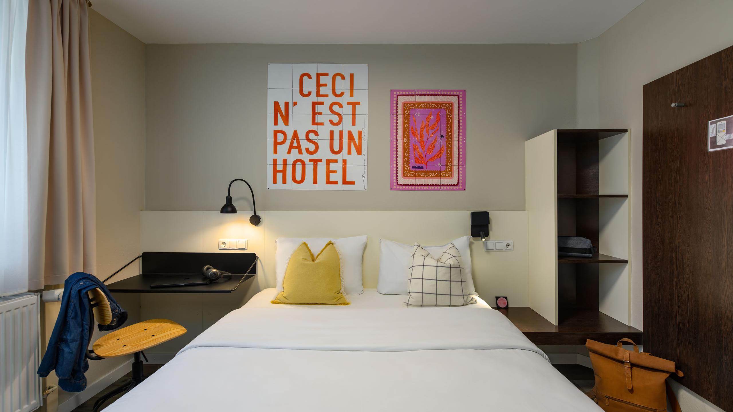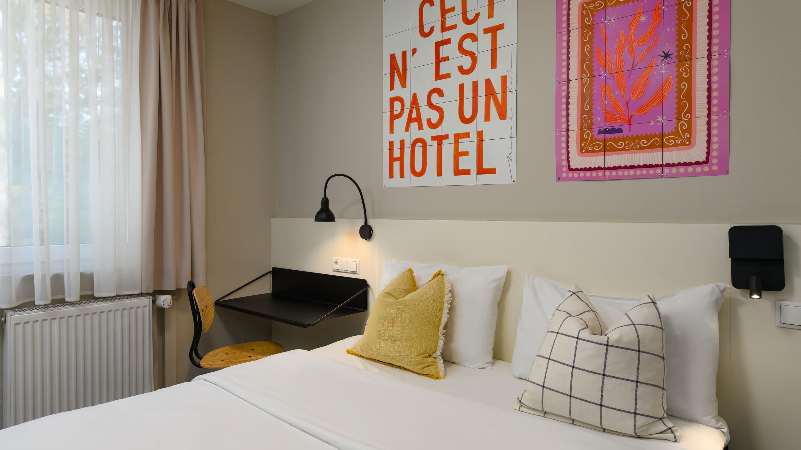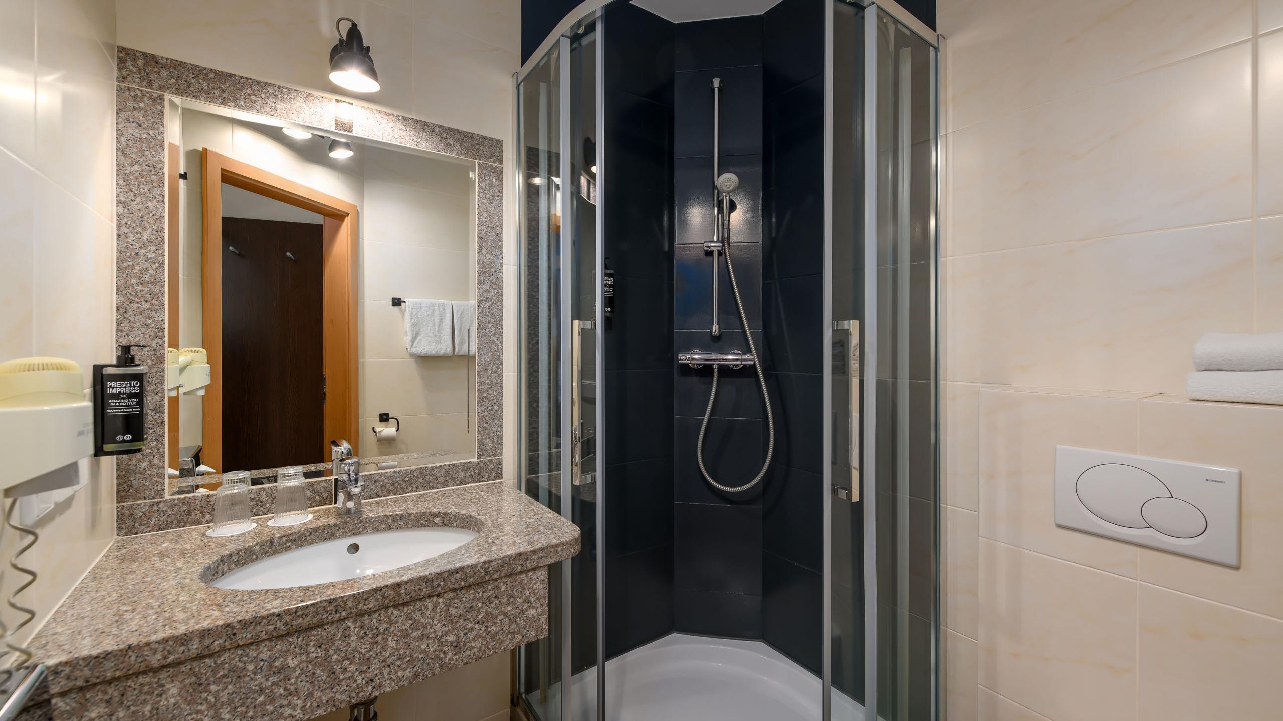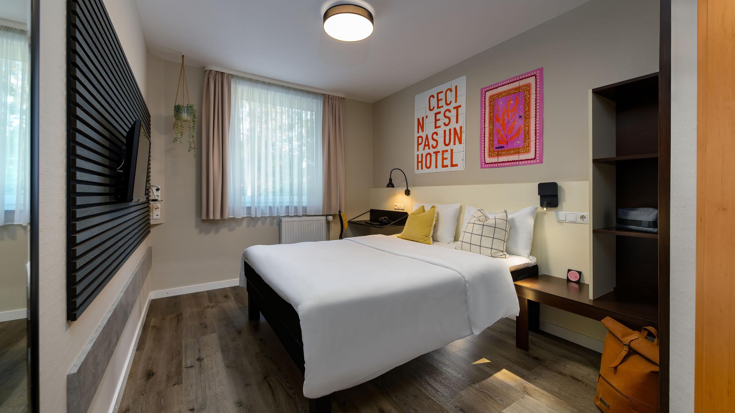 Double bed (160 x 200cm) or two twin beds (160 x 200cm) | Shower with WC | Hairdryer | LCD TV | Telephone | Wardrobe | Air conditioning | Wi-Fi | Soundproof window | Room-darkening options | City view