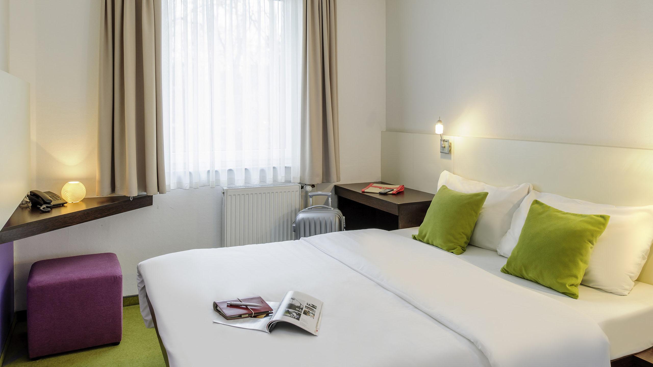 Double bed (160 x 200cm) or two twin beds (160 x 200cm) | Shower with WC | Hairdryer | LCD TV | Telephone | Wardrobe | Air conditioning | Wi-Fi | Soundproof window | Room-darkening options | City view